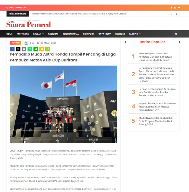 Pembalap Muda Astra Honda Tampil Kencang di Laga Pembuka Moto4 Asia Cup Buriram by masmul 8 Maret 2026 in Silahkan kunjungi https://www.suarapemredkalbar.com/read/potret/08032026/pembalap-muda-astra-honda-tampil-kencang-di-laga-pembuka-moto4-asia-cup-buriram. You Might Like Regional Public Launching New ADV160 The SUV Pride Grand Launching New PCX 160 Truly Exceptional! Tetap hati-hati ya bro sist berkendara saat hujan.