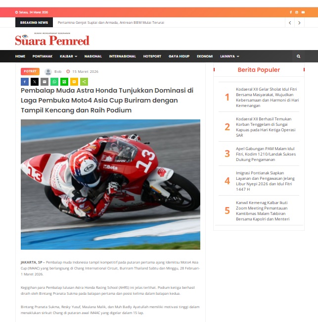 Pembalap Muda Astra Honda Tunjukkan Dominasi di Laga Pembuka Moto4 Asia Cup Buriram dengan Tampil Kencang dan Raih Podium by masmul 15 Maret 2026 in Silahkan kunjungi https://www.suarapemredkalbar.com/read/potret/15032026/pembalap-muda-astra-honda-tunjukkan-dominasi-di-laga-pembuka-moto4-asia-cup-buriram-dengan-tampil-kencang-dan-raih-podium. You Might Like Regional Public Launching New ADV160 The SUV Pride Grand Launching New PCX 160 Truly Exceptional! Tetap hati-hati ya bro sist berkendara saat hujan.