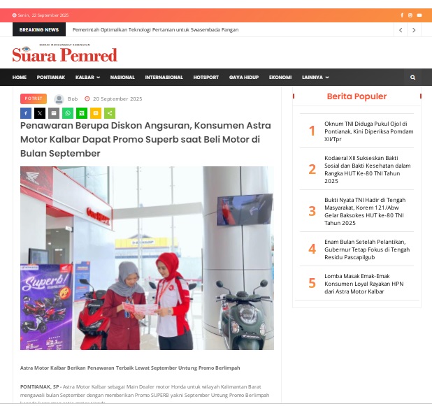 Penawaran Berupa Diskon Angsuran, Konsumen Astra Motor Kalbar Dapat Promo Superb saat Beli Motor di Bulan September by masmul 20 September 2025 in Silahkan kunjungi https://www.suarapemredkalbar.com/read/potret/20092025/penawaran-berupa-diskon-angsuran-konsumen-astra-motor-kalbar-dapat-promo-superb-saat-beli-motor-di-bulan-september. You Might Like Regional Public Launching New ADV160 The SUV Pride Grand Launching New PCX 160 Truly Exceptional! Tetap hati-hati ya bro sist berkendara saat hujan.