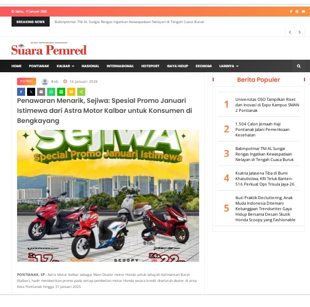 Penawaran Menarik, Sejiwa: Spesial Promo Januari Istimewa dari Astra Motor Kalbar untuk Konsumen di Bengkayang by masmul 16 Januari 2026 in Silahkan kunjungi https://www.suarapemredkalbar.com/read/potret/16012026/penawaran-menarik-sejiwa-spesial-promo-januari-istimewa-dari-astra-motor-kalbar-untuk-konsumen-di-bengkayang. You Might Like Regional Public Launching New ADV160 The SUV Pride Grand Launching New PCX 160 Truly Exceptional! Tetap hati-hati ya bro sist berkendara saat hujan.
