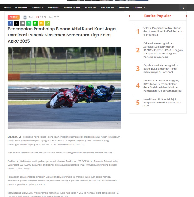 Pencapaian Pembalap Binaan AHM Kunci Kuat Jaga Dominasi Puncak Klasemen Sementara Tiga Kelas ARRC 2025 by masmul 19 Oktober 2025 in Silahkan kunjungi https://www.suarapemredkalbar.com/read/potret/19102025/pencapaian-pembalap-binaan-ahm-kunci-kuat-jaga-dominasi-puncak-klasemen-sementara-tiga-kelas-arrc-2025. You Might Like Regional Public Launching New ADV160 The SUV Pride Grand Launching New PCX 160 Truly Exceptional! Tetap hati-hati ya bro sist berkendara saat hujan.