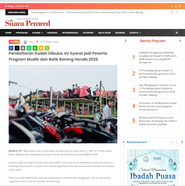 Pendaftaran Sudah Dibuka, Ini Syarat jadi Peserta Program Mudik dan Balik Bareng Honda 2026 by masmul 16 Februari 2026 in Silahkan kunjungi https://www.suarapemredkalbar.com/read/potret/16022026/pendaftaran-sudah-dibuka-ini-syarat-jadi-peserta-program-mudik-dan-balik-bareng-honda-2026. You Might Like Regional Public Launching New ADV160 The SUV Pride Grand Launching New PCX 160 Truly Exceptional! Tetap hati-hati ya bro sist berkendara saat hujan.