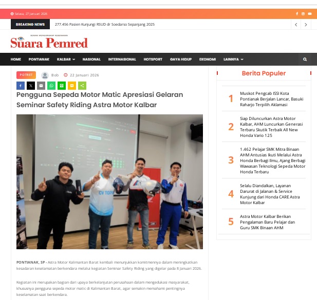 Pengguna Sepeda Motor Matic Apresiasi Gelaran Seminar Safety Riding Astra Motor Kalbar by masmul 22 Januari 2026 in Silahkan kunjungi https://www.suarapemredkalbar.com/read/potret/22012026/pengguna-sepeda-motor-matic-apresiasi-gelaran-seminar-safety-riding-astra-motor-kalbar. You Might Like Regional Public Launching New ADV160 The SUV Pride Grand Launching New PCX 160 Truly Exceptional! Tetap hati-hati ya bro sist berkendara saat hujan.