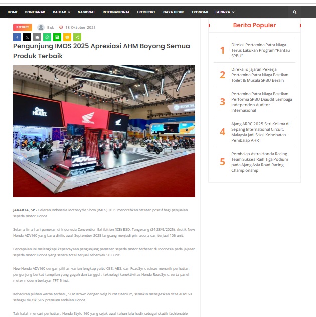 Pengunjung IMOS 2025 Apresiasi AHM Boyong Semua Produk Terbaik by masmul 18 Oktober 2025 in Silahkan kunjungi https://www.suarapemredkalbar.com/read/potret/18102025/pengunjung-imos-2025-apresiasi-ahm-boyong-semua-produk-terbaik. You Might Like Regional Public Launching New ADV160 The SUV Pride Grand Launching New PCX 160 Truly Exceptional! Tetap hati-hati ya bro sist berkendara saat hujan.