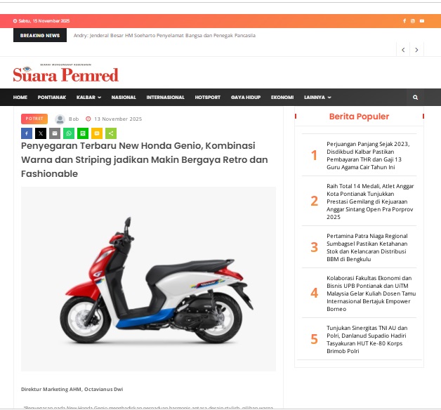 Penyegaran Terbaru New Honda Genio, Kombinasi Warna dan Striping jadikan Makin Bergaya Retro dan Fashionable by masmul 13 November 2025 in Silahkan kunjungi https://www.suarapemredkalbar.com/read/potret/13112025/penyegaran-terbaru-new-honda-genio-kombinasi-warna-dan-striping-jadikan-makin-bergaya-retro-dan-fashionable. You Might Like Regional Public Launching New ADV160 The SUV Pride Grand Launching New PCX 160 Truly Exceptional! Tetap hati-hati ya bro sist berkendara saat hujan.