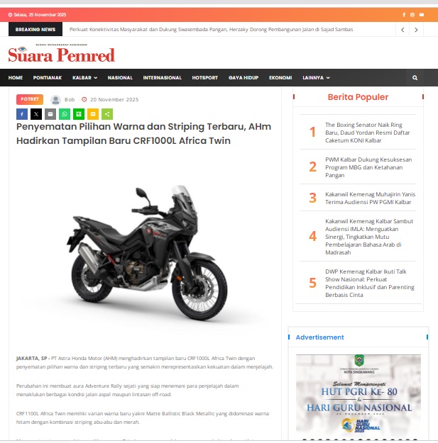 Penyematan Pilihan Warna dan Striping Terbaru, AHm Hadirkan Tampilan Baru CRF1000L Africa Twin by masmul 20 November 2025 in Silahkan kunjungi https://www.suarapemredkalbar.com/read/potret/20112025/penyematan-pilihan-warna-dan-striping-terbaru-ahm-hadirkan-tampilan-baru-crf1000l-africa-twin. You Might Like Regional Public Launching New ADV160 The SUV Pride Grand Launching New PCX 160 Truly Exceptional! Tetap hati-hati ya bro sist berkendara saat hujan.