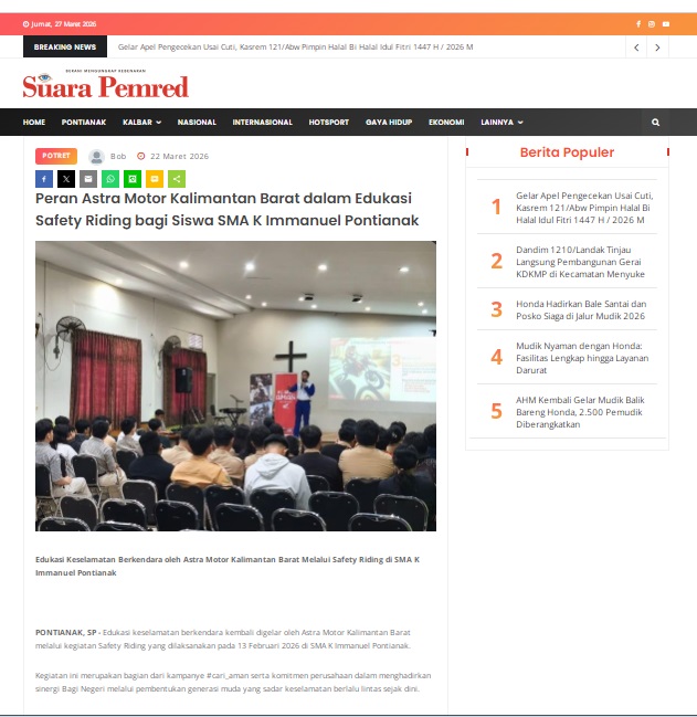 Peran Astra Motor Kalimantan Barat dalam Edukasi Safety Riding bagi Siswa SMA K Immanuel Pontianak by masmul 22 Maret 2026 in Silahkan kunjungi https://www.suarapemredkalbar.com/read/potret/22032026/peran-astra-motor-kalimantan-barat-dalam-edukasi-safety-riding-bagi-siswa-sma-k-immanuel-pontianak. You Might Like Regional Public Launching New ADV160 The SUV Pride Grand Launching New PCX 160 Truly Exceptional! Tetap hati-hati ya bro sist berkendara saat hujan.