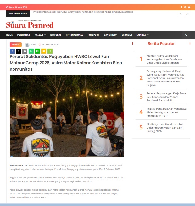 Pererat Solidaritas Paguyuban HWBC Lewat Fun Motour Camp 2026, Astra Motor Kalbar Konsisten Bina Komunitas by masmul 3 Maret 2026 in Silahkan kunjungi https://www.suarapemredkalbar.com/read/potret/03032026/pererat-solidaritas-paguyuban-hwbc-lewat-fun-motour-camp-2026-astra-motor-kalbar-konsisten-bina-komunitas. You Might Like Regional Public Launching New ADV160 The SUV Pride Grand Launching New PCX 160 Truly Exceptional! Tetap hati-hati ya bro sist berkendara saat hujan.