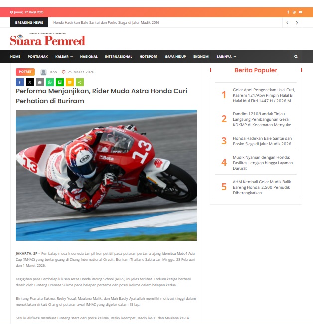 Performa Menjanjikan, Rider Muda Astra Honda Curi Perhatian di Buriram by masmul 25 Maret 2026 in Silahkan kunjungi https://www.suarapemredkalbar.com/read/potret/25032026/performa-menjanjikan-rider-muda-astra-honda-curi-perhatian-di-buriram. You Might Like Regional Public Launching New ADV160 The SUV Pride Grand Launching New PCX 160 Truly Exceptional! Tetap hati-hati ya bro sist berkendara saat hujan.