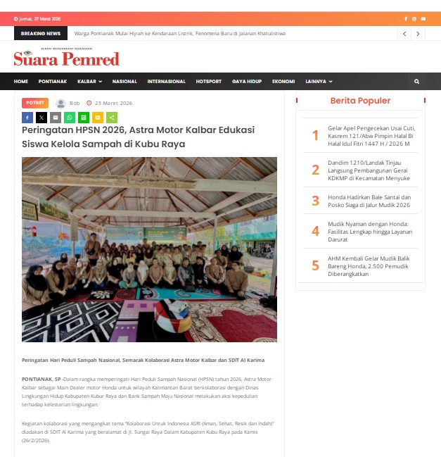 Peringatan HPSN 2026, Astra Motor Kalbar Edukasi Siswa Kelola Sampah di Kubu Raya by masmul 23 Maret 2026 in Silahkan kunjungi https://www.suarapemredkalbar.com/read/potret/23032026/peringatan-hpsn-2026-astra-motor-kalbar-edukasi-siswa-kelola-sampah-di-kubu-raya. You Might Like Regional Public Launching New ADV160 The SUV Pride Grand Launching New PCX 160 Truly Exceptional! Tetap hati-hati ya bro sist berkendara saat hujan.