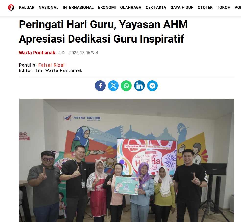 Peringati Hari Guru, Yayasan AHM Apresiasi Dedikasi Guru Inspiratif by Faisal Rizal 4 Desember 2025 in Silahkan kunjungi https://wartapontianak.pikiran-rakyat.com/gaya-hidup/pr-1179839471/peringati-hari-guru-yayasan-ahm-apresiasi-dedikasi-guru-inspiratif. You Might Like Regional Public Launching New ADV160 The SUV Pride Grand Launching New PCX 160 Truly Exceptional! Tetap hati-hati ya bro sist berkendara saat hujan.
