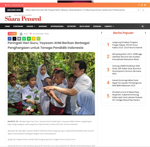 Peringati Hari Guru, Yayasan AHM Berikan Berbagai Penghargaan untuk Tenaga Pendidik Indonesia by masmul 3 Desember 2025 in Silahkan kunjungi https://www.suarapemredkalbar.com/read/potret/03122025/peringati-hari-guru-yayasan-ahm-berikan-berbagai-penghargaan-untuk-tenaga-pendidik-indonesia. You Might Like Regional Public Launching New ADV160 The SUV Pride Grand Launching New PCX 160 Truly Exceptional! Tetap hati-hati ya bro sist berkendara saat hujan.