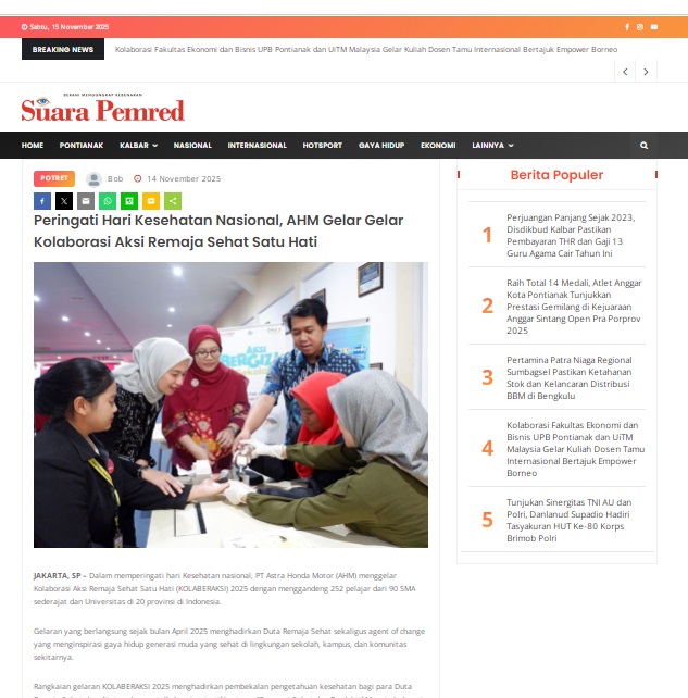 Peringati Hari Kesehatan Nasional, AHM Gelar Gelar Kolaborasi Aksi Remaja Sehat Satu Hati by masmul 14 November 2025 in Silahkan kunjungi https://www.suarapemredkalbar.com/read/potret/14112025/peringati-hari-kesehatan-nasional-ahm-gelar-gelar-kolaborasi-aksi-remaja-sehat-satu-hati. You Might Like Regional Public Launching New ADV160 The SUV Pride Grand Launching New PCX 160 Truly Exceptional! Tetap hati-hati ya bro sist berkendara saat hujan.