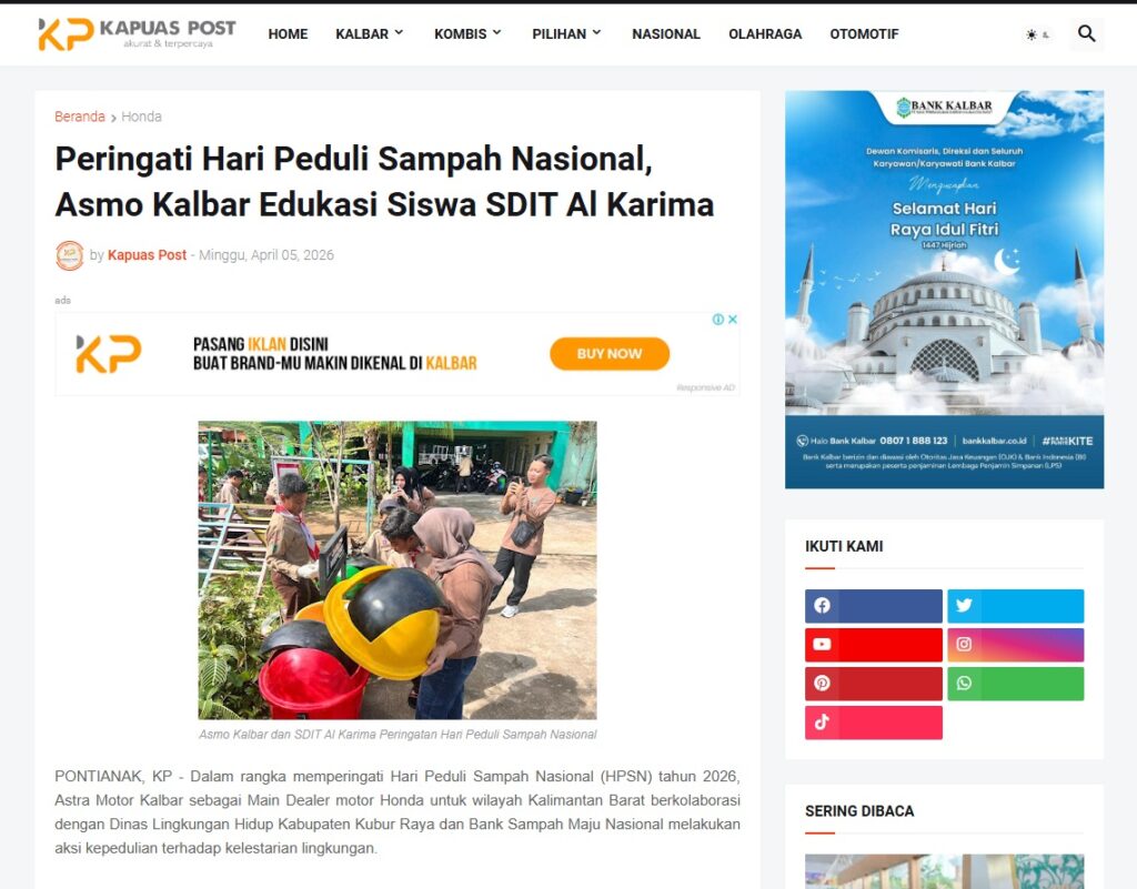 Peringati Hari Peduli Sampah Nasional, Asmo Kalbar Edukasi Siswa SDIT Al Karima by Muhammad Arif 5 April 2026 in Silahkan kunjungi https://www.kapuaspost.web.id/2026/04/peringati-hari-peduli-sampah-nasional.html. Tags: astra Astra Motor kalbar Astra Motor Pontianak astramotor honda kalbar pontianak sepeda motor You Might Like Regional Public Launching New ADV160 The SUV Pride Grand Launching New PCX 160 Truly Exceptional! Tetap hati-hati ya bro sist berkendara saat hujan.