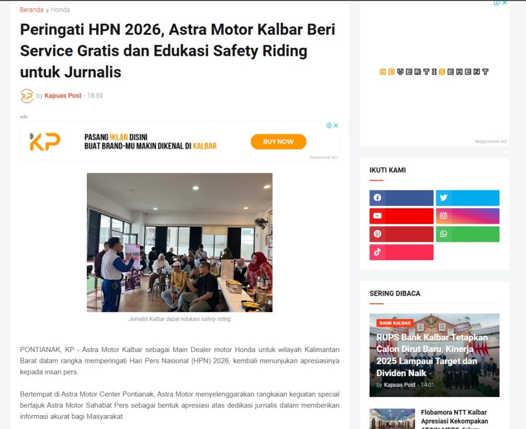 Peringati HPN 2026, Astra Motor Kalbar Beri Service Gratis dan Edukasi Safety Riding untuk Jurnalis by Muhammad Arif 16 Februari 2026 in Silahkan kunjungi https://www.kapuaspost.web.id/2026/02/peringati-hpn-2026-astra-motor-kalbar.html. Tags: astra Astra Motor kalbar Astra Motor Pontianak astramotor honda kalbar pontianak sepeda motor You Might Like Regional Public Launching New ADV160 The SUV Pride Grand Launching New PCX 160 Truly Exceptional! Tetap hati-hati ya bro sist berkendara saat hujan.