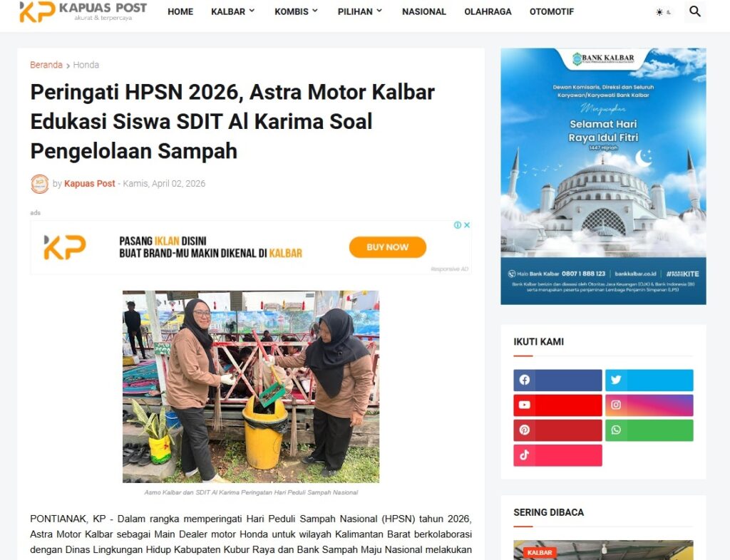 Peringati HPSN 2026, Astra Motor Kalbar Edukasi Siswa SDIT Al Karima Soal Pengelolaan Sampah by Muhammad Arif 2 April 2026 in Silahkan kunjungi https://www.kapuaspost.web.id/2026/04/peringati-hpsn-2026-astra-motor-kalbar.html. Tags: astra Astra Motor kalbar Astra Motor Pontianak astramotor honda kalbar pontianak sepeda motor You Might Like Regional Public Launching New ADV160 The SUV Pride Grand Launching New PCX 160 Truly Exceptional! Tetap hati-hati ya bro sist berkendara saat hujan.