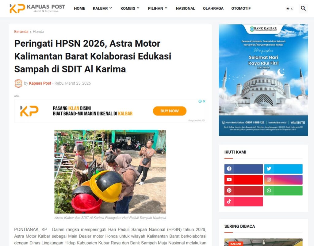 Peringati HPSN 2026, Astra Motor Kalimantan Barat Kolaborasi Edukasi Sampah di SDIT Al Karima