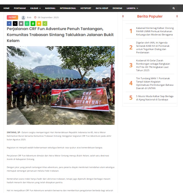 Perjalanan CRF Fun Adventure Penuh Tantangan, Komunitas Trabasan Sintang Taklukkan Jalanan Bukit Kelam by masmul 8 September 2025 in Silahkan kunjungi https://www.suarapemredkalbar.com/read/potret/08092025/perjalanan-crf-fun-adventure-penuh-tantangan-komunitas-trabasan-sintang-taklukkan-jalanan-bukit-kelam. You Might Like Regional Public Launching New ADV160 The SUV Pride Grand Launching New PCX 160 Truly Exceptional! Tetap hati-hati ya bro sist berkendara saat hujan.