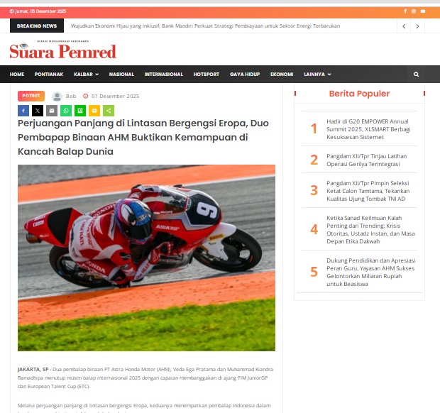 Perjuangan Panjang di Lintasan Bergengsi Eropa, Duo Pembapap Binaan AHM Buktikan Kemampuan di Kancah Balap Dunia by masmul 1 Desember 2025 in Silahkan kunjungi https://www.suarapemredkalbar.com/read/potret/01122025/perjuangan-panjang-di-lintasan-bergengsi-eropa-duo-pembapap-binaan-ahm-buktikan-kemampuan-di-kancah-balap-dunia. You Might Like Regional Public Launching New ADV160 The SUV Pride Grand Launching New PCX 160 Truly Exceptional! Tetap hati-hati ya bro sist berkendara saat hujan.