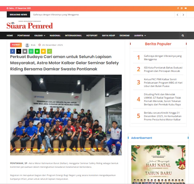Perkuat Budaya Cari aman untuk Seluruh Lapisan Masyarakat, Astra Motor Kalbar Gelar Seminar Safety Riding Bersama Damkar Swasta Pontianak by masmul 26 Desember 2025 in Silahkan kunjungi https://www.suarapemredkalbar.com/read/potret/26122025/perkuat-budaya-cari-aman-untuk-seluruh-lapisan-masyarakat-astra-motor-kalbar-gelar-seminar-safety-riding-bersama-damkar-swasta-pontianak. You Might Like Regional Public Launching New ADV160 The SUV Pride Grand Launching New PCX 160 Truly Exceptional! Tetap hati-hati ya bro sist berkendara saat hujan.