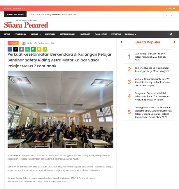 Perkuat Keselamatan Berkendara di Kalangan Pelajar, Seminar Safety Riding Astra Motor Kalbar Sasar Pelajar SMKN 7 Pontianak by masmul 30 Januari 2026 in Silahkan kunjungi https://www.suarapemredkalbar.com/read/potret/30012026/perkuat-keselamatan-berkendara-di-kalangan-pelajar-seminar-safety-riding-astra-motor-kalbar-sasar-pelajar-smkn-7-pontianak. You Might Like Regional Public Launching New ADV160 The SUV Pride Grand Launching New PCX 160 Truly Exceptional! Tetap hati-hati ya bro sist berkendara saat hujan.