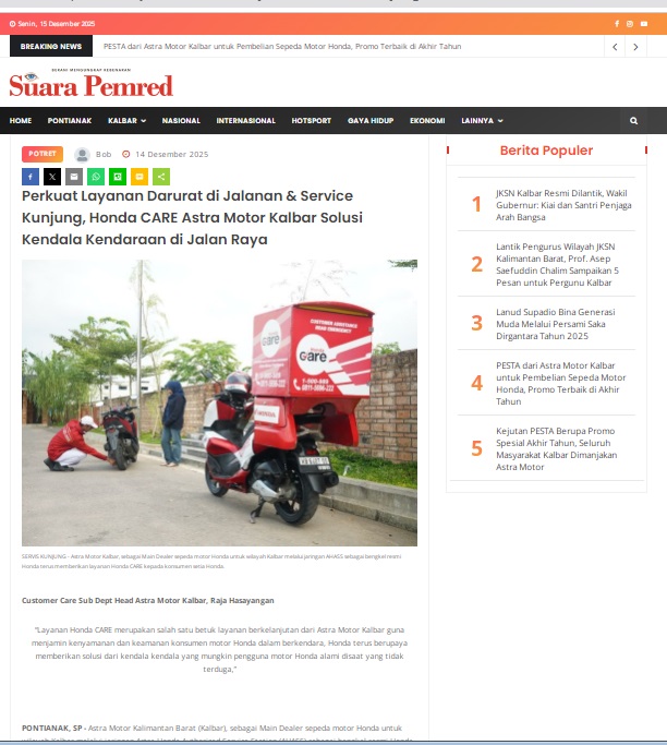 Perkuat Layanan Darurat di Jalanan & Service Kunjung, Honda CARE Astra Motor Kalbar Solusi Kendala Kendaraan di Jalan Raya by masmul 14 Desember 2025 in Silahkan kunjungi https://www.suarapemredkalbar.com/read/potret/14122025/perkuat-layanan-darurat-di-jalanan-service-kunjung-honda-care-astra-motor-kalbar-solusi-kendala-kendaraan-di-jalan-raya. You Might Like Regional Public Launching New ADV160 The SUV Pride Grand Launching New PCX 160 Truly Exceptional! Tetap hati-hati ya bro sist berkendara saat hujan.