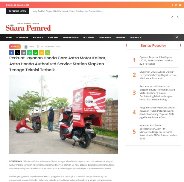 Perkuat Layanan Honda Care Astra Motor Kalbar, Astra Honda Authorized Service Station Siapkan Tenaga Teknisi Terbaik by masmul 21 Desember 2025 in Silahkan kunjungi https://www.suarapemredkalbar.com/read/potret/21122025/perkuat-layanan-honda-care-astra-motor-kalbar-astra-honda-authorized-service-station-siapkan-tenaga-teknisi-terbaik. You Might Like Regional Public Launching New ADV160 The SUV Pride Grand Launching New PCX 160 Truly Exceptional! Tetap hati-hati ya bro sist berkendara saat hujan.