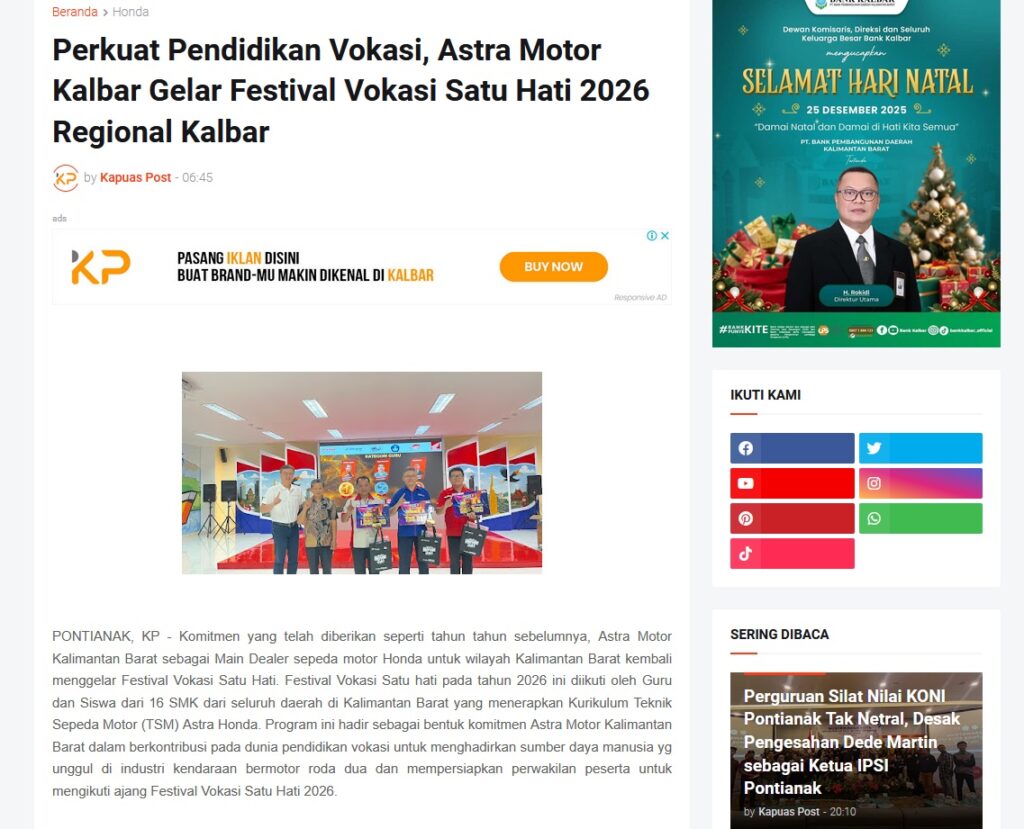 Perkuat Pendidikan Vokasi, Astra Motor Kalbar Gelar Festival Vokasi Satu Hati 2026 Regional Kalbar by Muhammad Arif 30 Desember 2025 in Silahkan kunjungi https://www.kapuaspost.web.id/2025/12/perkuat-pendidikan-vokasi-astra-motor.html. Tags: astra Astra Motor kalbar Astra Motor Pontianak astramotor honda kalbar pontianak sepeda motor You Might Like Regional Public Launching New ADV160 The SUV Pride Grand Launching New PCX 160 Truly Exceptional! Tetap hati-hati ya bro sist berkendara saat hujan.