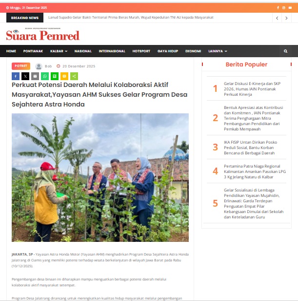 Perkuat Potensi Daerah Melalui Kolaboraksi Aktif Masyarakat,Yayasan AHM Sukses Gelar Program Desa Sejahtera Astra Honda by masmul 20 Desember 2025 in Silahkan kunjungi https://www.suarapemredkalbar.com/read/potret/20122025/perkuat-potensi-daerah-melalui-kolaboraksi-aktif-masyarakatyayasan-ahm-sukses-gelar-program-desa-sejahtera-astra-honda. You Might Like Regional Public Launching New ADV160 The SUV Pride Grand Launching New PCX 160 Truly Exceptional! Tetap hati-hati ya bro sist berkendara saat hujan.