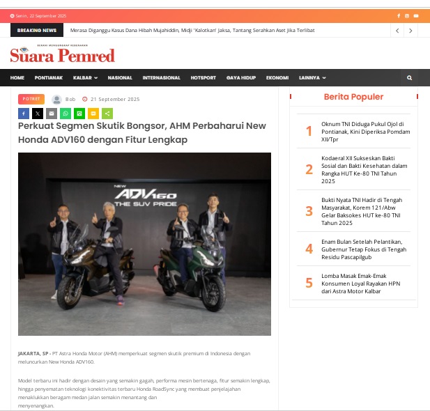Perkuat Segmen Skutik Bongsor, AHM Perbaharui New Honda ADV160 dengan Fitur Lengkap by masmul 21 September 2025 in Silahkan kunjungi https://www.suarapemredkalbar.com/read/potret/21092025/perkuat-segmen-skutik-bongsor-ahm-perbaharui-new-honda-adv160-dengan-fitur-lengkap. You Might Like Regional Public Launching New ADV160 The SUV Pride Grand Launching New PCX 160 Truly Exceptional! Tetap hati-hati ya bro sist berkendara saat hujan.