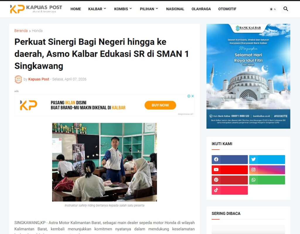 Perkuat Sinergi Bagi Negeri hingga ke daerah, Asmo Kalbar Edukasi SR di SMAN 1 Singkawang by Muhammad Arif 7 April 2026 in Silahkan kunjungi https://www.kapuaspost.web.id/2026/04/perkuat-sinergi-bagi-negeri-hingga-ke.html. Tags: astra Astra Motor kalbar Astra Motor Pontianak astramotor honda kalbar pontianak sepeda motor You Might Like Regional Public Launching New ADV160 The SUV Pride Grand Launching New PCX 160 Truly Exceptional! Tetap hati-hati ya bro sist berkendara saat hujan.