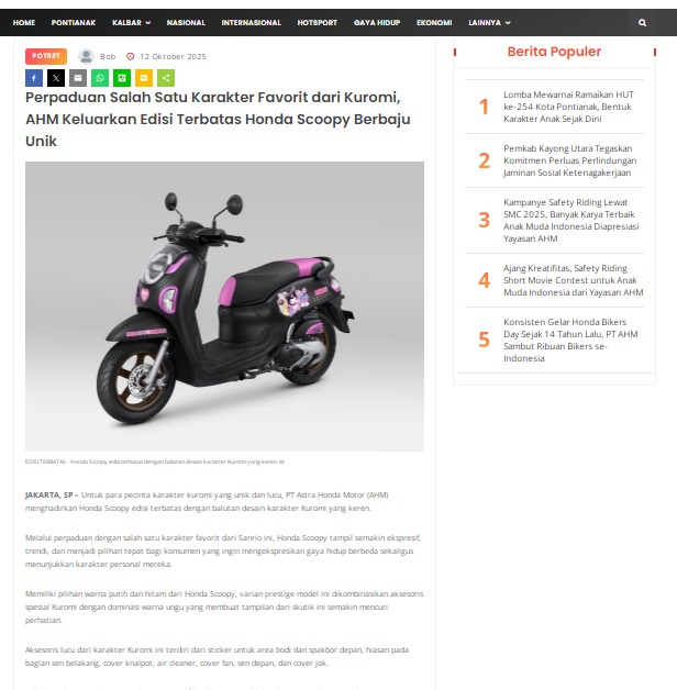 Perpaduan Salah Satu Karakter Favorit dari Kuromi, AHM Keluarkan Edisi Terbatas Honda Scoopy Berbaju Unik by masmul 12 Oktober 2025 in Silahkan kunjungi https://www.suarapemredkalbar.com/read/potret/12102025/perpaduan-salah-satu-karakter-favorit-dari-kuromi-ahm-keluarkan-edisi-terbatas-honda-scoopy-berbaju-unik. You Might Like Regional Public Launching New ADV160 The SUV Pride Grand Launching New PCX 160 Truly Exceptional! Tetap hati-hati ya bro sist berkendara saat hujan.
