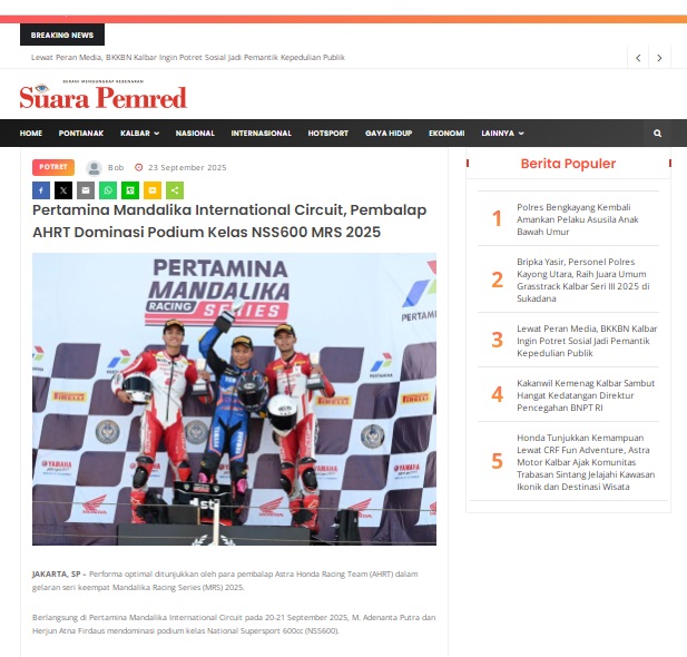 Pertamina Mandalika International Circuit, Pembalap AHRT Dominasi Podium Kelas NSS600 MRS 2025 by masmul 23 September 2025 in Silahkan kunjungi https://www.suarapemredkalbar.com/read/potret/23092025/pertamina-mandalika-international-circuit-pembalap-ahrt-dominasi-podium-kelas-nss600-mrs-2025. You Might Like Regional Public Launching New ADV160 The SUV Pride Grand Launching New PCX 160 Truly Exceptional! Tetap hati-hati ya bro sist berkendara saat hujan.