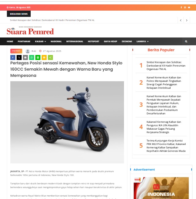 Pertegas Posisi sensasi Kemewahan, New Honda Stylo 160CC Semakin Mewah dengan Warna Baru yang Mempesona by masmul 27 Agustus 2025 in Silahkan kunjungi https://www.suarapemredkalbar.com/read/potret/27082025/pertegas-posisi-sensasi-kemewahan-new-honda-stylo-160cc-semakin-mewah-dengan-warna-baru-yang-mempesona. You Might Like Regional Public Launching New ADV160 The SUV Pride Grand Launching New PCX 160 Truly Exceptional! Tetap hati-hati ya bro sist berkendara saat hujan.