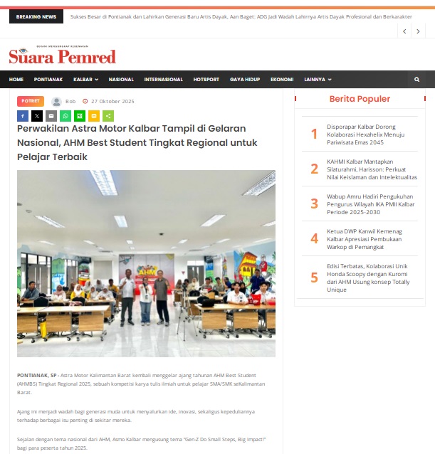 Perwakilan Astra Motor Kalbar Tampil di Gelaran Nasional, AHM Best Student Tingkat Regional untuk Pelajar Terbaik by masmul 27 Oktober 2025 in Silahkan kunjungi https://www.suarapemredkalbar.com/read/potret/27102025/perwakilan-astra-motor-kalbar-tampil-di-gelaran-nasional-ahm-best-student-tingkat-regional-untuk-pelajar-terbaik. You Might Like Regional Public Launching New ADV160 The SUV Pride Grand Launching New PCX 160 Truly Exceptional! Tetap hati-hati ya bro sist berkendara saat hujan.