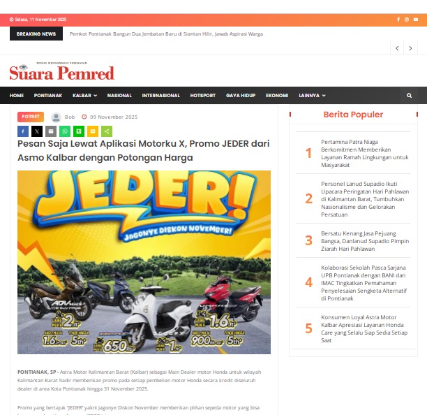 Pesan Saja Lewat Aplikasi Motorku X, Promo JEDER dari Asmo Kalbar dengan Potongan Harga by masmul 9 November 2025 in Silahkan kunjungi https://www.suarapemredkalbar.com/read/potret/09112025/pesan-saja-lewat-aplikasi-motorku-x-promo-jeder-dari-asmo-kalbar-dengan-potongan-harga. You Might Like Regional Public Launching New ADV160 The SUV Pride Grand Launching New PCX 160 Truly Exceptional! Tetap hati-hati ya bro sist berkendara saat hujan.