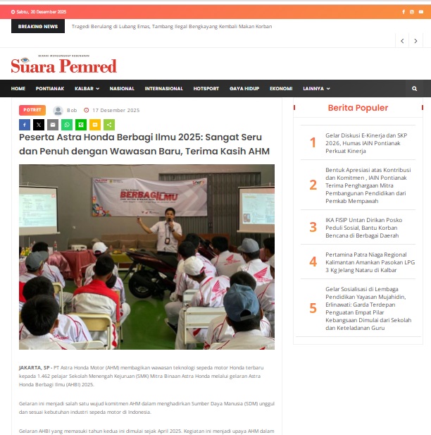 Peserta Astra Honda Berbagi Ilmu 2025: Sangat Seru dan Penuh dengan Wawasan Baru, Terima Kasih AHM by masmul 17 Desember 2025 in Silahkan kunjungi https://www.suarapemredkalbar.com/read/potret/17122025/peserta-astra-honda-berbagi-ilmu-2025-sangat-seru-dan-penuh-dengan-wawasan-baru-terima-kasih-ahm. You Might Like Regional Public Launching New ADV160 The SUV Pride Grand Launching New PCX 160 Truly Exceptional! Tetap hati-hati ya bro sist berkendara saat hujan.