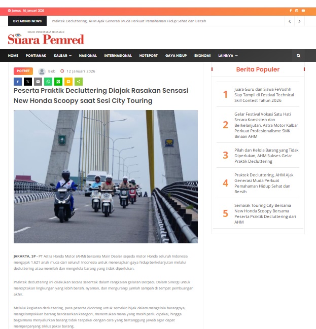 Peserta Praktik Decluttering Diajak Rasakan Sensasi New Honda Scoopy saat Sesi City Touring by masmul 12 Januari 2026 in Silahkan kunjungi https://www.suarapemredkalbar.com/read/potret/12012026/peserta-praktik-decluttering-diajak-rasakan-sensasi-new-honda-scoopy-saat-sesi-city-touring. You Might Like Regional Public Launching New ADV160 The SUV Pride Grand Launching New PCX 160 Truly Exceptional! Tetap hati-hati ya bro sist berkendara saat hujan.