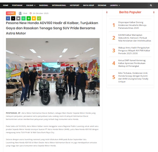 Pesona New Honda ADV160 Hadir di Kalbar, Tunjukkan Gaya dan Rasakan Tenaga Sang SUV Pride Bersama Astra Motor by masmul 26 Oktober 2025 in Silahkan kunjungi https://www.suarapemredkalbar.com/read/potret/26102025/pesona-new-honda-adv160-hadir-di-kalbar-tunjukkan-gaya-dan-rasakan-tenaga-sang-suv-pride-bersama-astra-motor. You Might Like Regional Public Launching New ADV160 The SUV Pride Grand Launching New PCX 160 Truly Exceptional! Tetap hati-hati ya bro sist berkendara saat hujan.