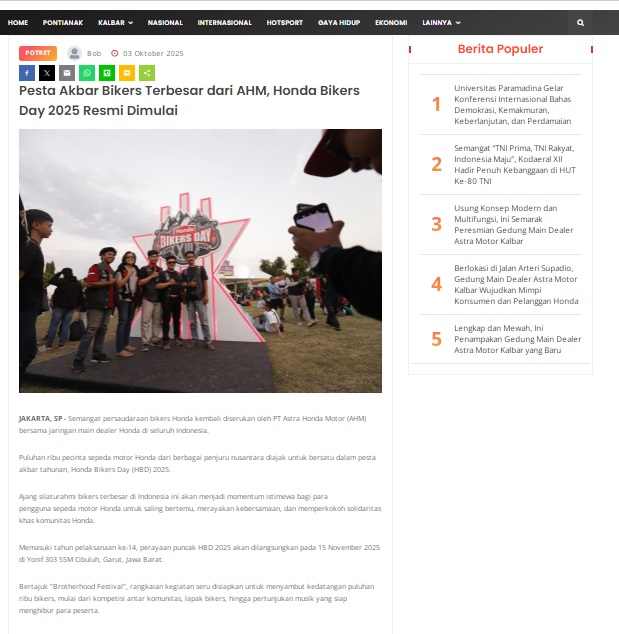 Pesta Akbar Bikers Terbesar dari AHM, Honda Bikers Day 2025 Resmi Dimulai by masmul 3 Oktober 2025 in Silahkan kunjungi https://www.suarapemredkalbar.com/read/potret/03102025/pesta-akbar-bikers-terbesar-dari-ahm-honda-bikers-day-2025-resmi-dimulai. You Might Like Regional Public Launching New ADV160 The SUV Pride Grand Launching New PCX 160 Truly Exceptional! Tetap hati-hati ya bro sist berkendara saat hujan.