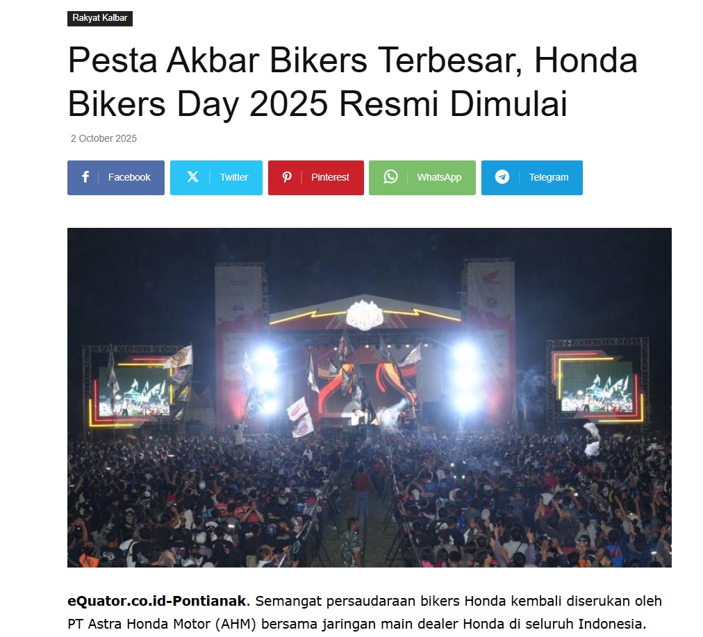 Pesta Akbar Bikers Terbesar, Honda Bikers Day 2025 Resmi Dimulai by Nova Sari 2 Oktober 2025 in Silahkan kunjungi https://equator.co.id/pesta-akbar-bikers-terbesar-honda-bikers-day-2025-resmi-dimulai/. You Might Like Regional Public Launching New ADV160 The SUV Pride Grand Launching New PCX 160 Truly Exceptional! Tetap hati-hati ya bro sist berkendara saat hujan.