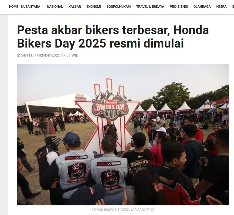 Pesta akbar bikers terbesar, Honda Bikers Day 2025 resmi dimulai by Dedi 7 Oktober 2025 in Silahkan kunjungi https://kalbar.antaranews.com/berita/668805/pesta-akbar-bikers-terbesar-honda-bikers-day-2025-resmi-dimulai. You Might Like Regional Public Launching New ADV160 The SUV Pride Grand Launching New PCX 160 Truly Exceptional! Tetap hati-hati ya bro sist berkendara saat hujan.