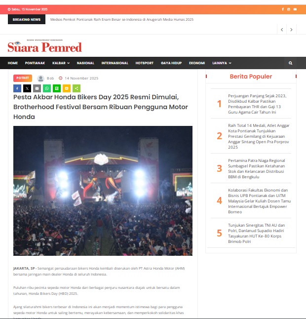 Pesta Akbar Honda Bikers Day 2025 Resmi Dimulai, Brotherhood Festival Bersam Ribuan Pengguna Motor Honda by masmul 14 November 2025 in Silahkan kunjungi https://www.suarapemredkalbar.com/read/potret/14112025/pesta-akbar-honda-bikers-day-2025-resmi-dimulai-brotherhood-festival-bersam-ribuan-pengguna-motor-honda. You Might Like Regional Public Launching New ADV160 The SUV Pride Grand Launching New PCX 160 Truly Exceptional! Tetap hati-hati ya bro sist berkendara saat hujan.