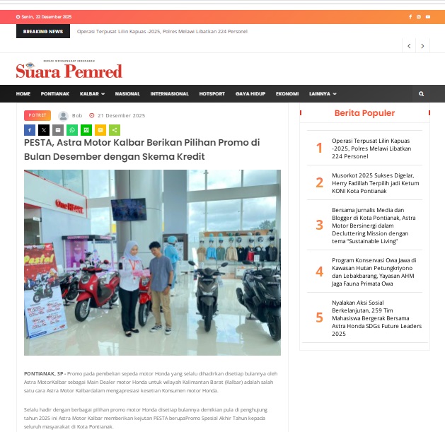 PESTA, Astra Motor Kalbar Berikan Pilihan Promo di Bulan Desember dengan Skema Kredit by masmul 21 Desember 2025 in Silahkan kunjungi https://www.suarapemredkalbar.com/read/potret/21122025/pesta-astra-motor-kalbar-berikan-pilihan-promo-di-bulan-desember-dengan-skema-kredit. You Might Like Regional Public Launching New ADV160 The SUV Pride Grand Launching New PCX 160 Truly Exceptional! Tetap hati-hati ya bro sist berkendara saat hujan.