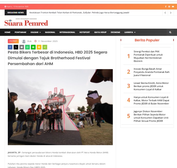 Pesta Bikers Terbesar di Indonesia, HBD 2025 Segera Dimulai dengan Tajuk Brotherhood Festival Persembahan dari AHM by masmul 11 November 2025 in Silahkan kunjungi https://www.suarapemredkalbar.com/read/potret/11112025/pesta-bikers-terbesar-di-indonesia-hbd-2025-segera-dimulai-dengan-tajuk-brotherhood-festival-persembahan-dari-ahm. You Might Like Regional Public Launching New ADV160 The SUV Pride Grand Launching New PCX 160 Truly Exceptional! Tetap hati-hati ya bro sist berkendara saat hujan.