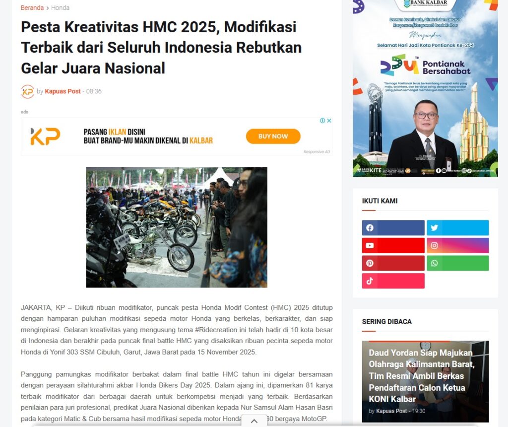 Pesta Kreativitas HMC 2025, Modifikasi Terbaik dari Seluruh Indonesia Rebutkan Gelar Juara Nasional by Muhammad Arif 16 November 2025 in Silahkan kunjungi https://www.kapuaspost.web.id/2025/11/pesta-kreativitas-hmc-2025-modifikasi.html. Tags: astra Astra Motor kalbar Astra Motor Pontianak astramotor honda kalbar pontianak sepeda motor You Might Like Regional Public Launching New ADV160 The SUV Pride Grand Launching New PCX 160 Truly Exceptional! Tetap hati-hati ya bro sist berkendara saat hujan.