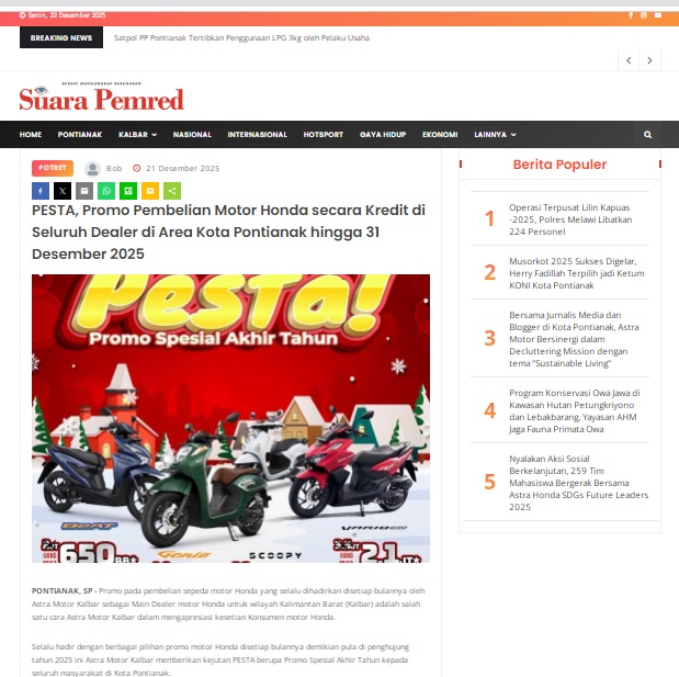 PESTA, Promo Pembelian Motor Honda secara Kredit di Seluruh Dealer di Area Kota Pontianak hingga 31 Desember 2025 by masmul 21 Desember 2025 in Silahkan kunjungi https://www.suarapemredkalbar.com/read/potret/21122025/pesta-promo-pembelian-motor-honda-secara-kredit-di-seluruh-dealer-di-area-kota-pontianak-hingga-31-desember-2025. You Might Like Regional Public Launching New ADV160 The SUV Pride Grand Launching New PCX 160 Truly Exceptional! Tetap hati-hati ya bro sist berkendara saat hujan.