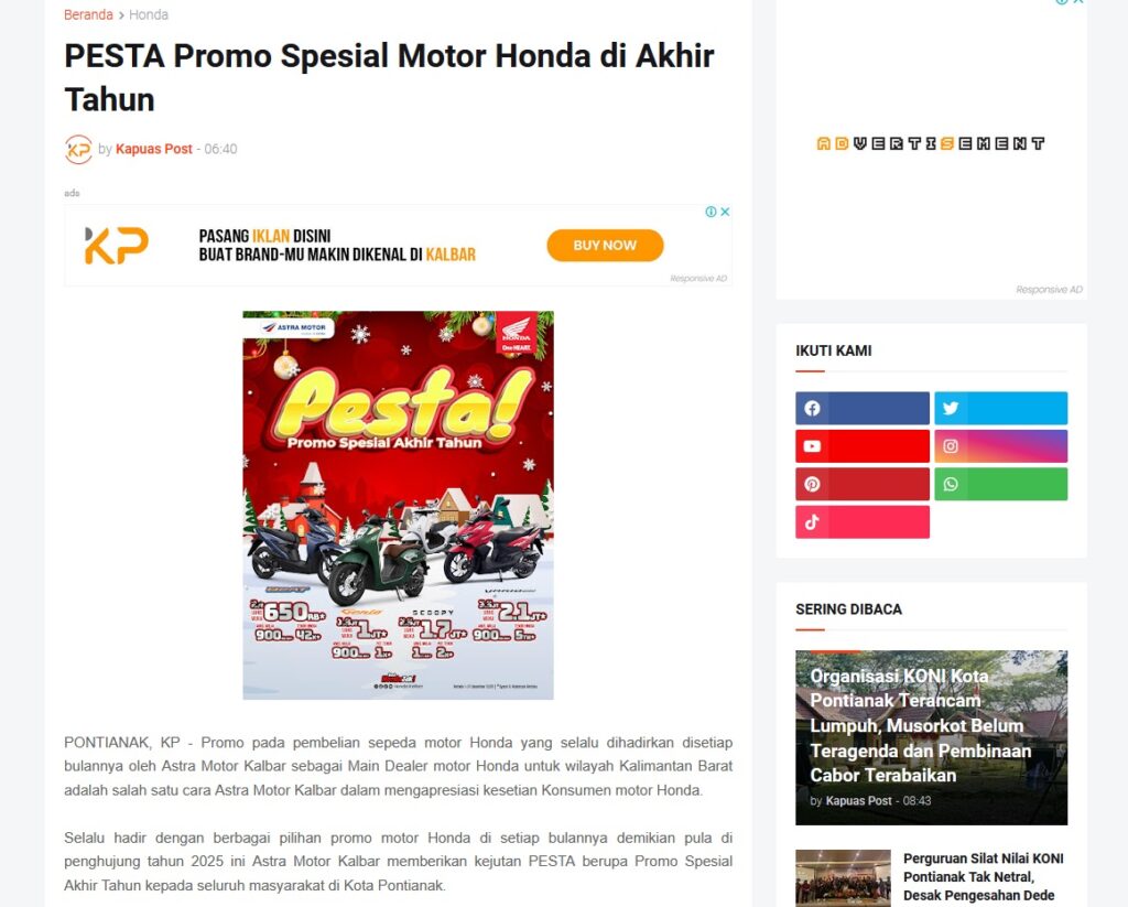 PESTA Promo Spesial Motor Honda di Akhir Tahun by Muhammad Arif 12 Desember 2025 in Silahkan kunjungi https://www.kapuaspost.web.id/2025/12/pesta-promo-spesial-motor-honda-di.html. Tags: astra Astra Motor kalbar Astra Motor Pontianak astramotor honda kalbar pontianak sepeda motor You Might Like Regional Public Launching New ADV160 The SUV Pride Grand Launching New PCX 160 Truly Exceptional! Tetap hati-hati ya bro sist berkendara saat hujan.