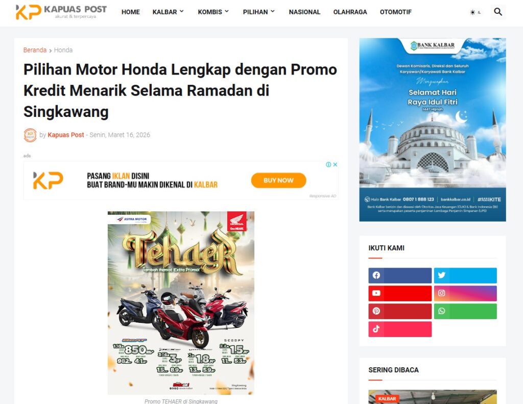 Pilihan Motor Honda Lengkap dengan Promo Kredit Menarik Selama Ramadan di Singkawang by Muhammad Arif 16 Maret 2026 in Silahkan kunjungi https://www.kapuaspost.web.id/2026/03/pilihan-motor-honda-lengkap-dengan.html. Tags: astra Astra Motor kalbar Astra Motor Pontianak astramotor honda kalbar pontianak sepeda motor You Might Like Regional Public Launching New ADV160 The SUV Pride Grand Launching New PCX 160 Truly Exceptional! Tetap hati-hati ya bro sist berkendara saat hujan.