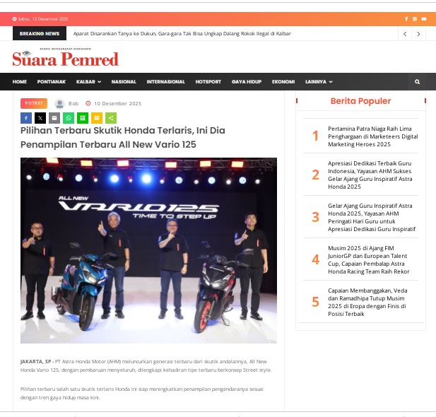 Pilihan Terbaru Skutik Honda Terlaris, Ini Dia Penampilan Terbaru All New Vario 125 by masmul 10 Desember 2025 in Silahkan kunjungi https://www.suarapemredkalbar.com/read/potret/10122025/pilihan-terbaru-skutik-honda-terlaris-ini-dia-penampilan-terbaru-all-new-vario-125. You Might Like Regional Public Launching New ADV160 The SUV Pride Grand Launching New PCX 160 Truly Exceptional! Tetap hati-hati ya bro sist berkendara saat hujan.